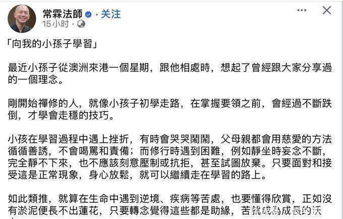 在与孙子共同度过时光的过程中,叶青霖依然保持着出家人的传统作风,穿着僧袍。这不仅是对自己修行生活的坚守,也体现了他内心对佛教教义的执着。在与孙子相处的日子里,他不仅享受到了无与伦比的亲情,也从这段简单却充满爱的时光中获得了深刻的感悟。叶青霖曾在自己的反思中提到,从孙子身上,他学到了无知的纯真。禅修的过程就像是孩子学习走路,初时的跌倒并不意味着失败,而是通过不断的摔倒,他们逐渐学会如何稳步前行。对他来说,甚至最微不足道的事情,都能触动他内心最深处的感受。