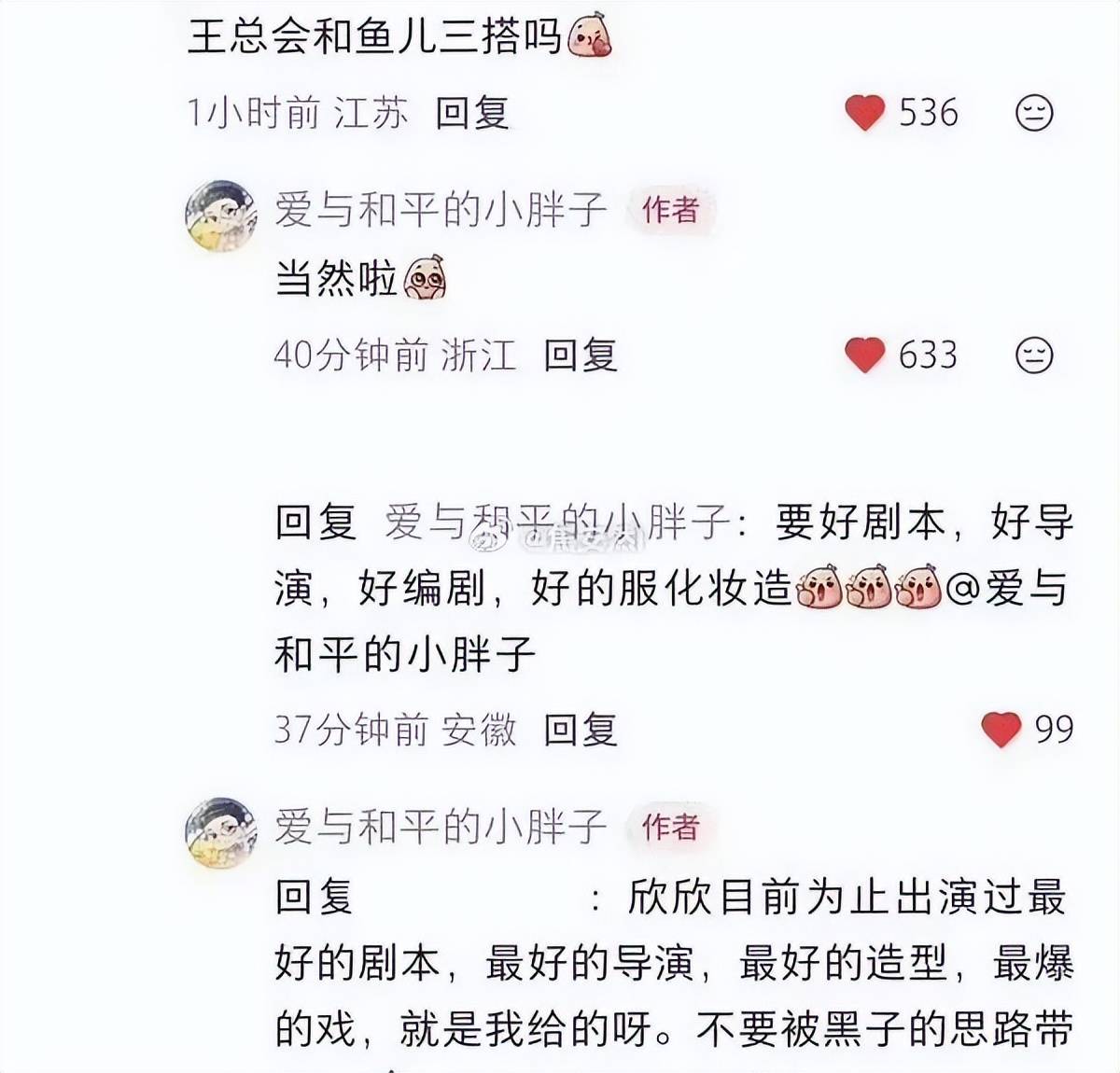 在回复网友关于“是否三搭虞书欣”的提问时,王一栩表示:“虞书欣最好的剧本、导演、造型、最爆的戏都是我给的”,