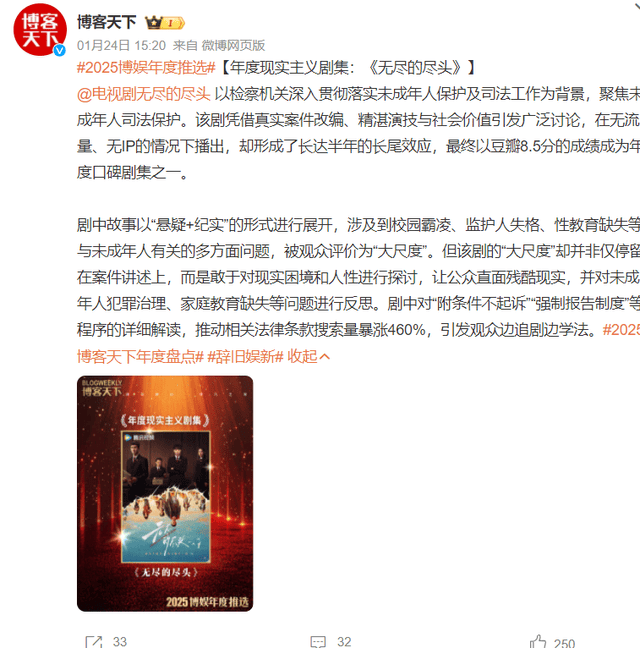 《无尽的尽头》是一部高质量电视剧,它聚焦于未成年人司法保护,讲述的是:在检察小组初创期,检察官林之桃与助理检察员白恩宇,为了孩子们,携手对抗人性之“恶”的故事。