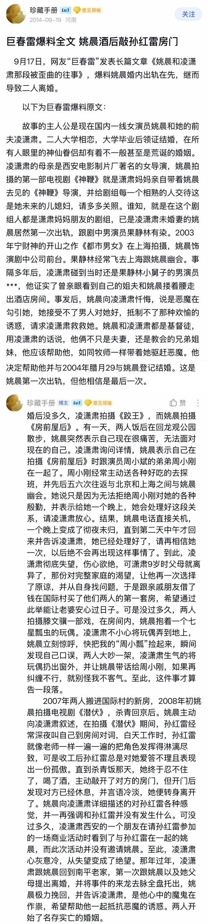 2014年9月17日,公开了一篇长篇文章,题为《姚晨和凌潇肃那段被歪曲的往事》,其中对姚晨进行了四次的不忠指控,并明确表示这样做的目的是为了“避免让凌潇肃和唐一菲受到不应有的冤屈”。孙红雷、果静林、周小刚和曹郁被巨春雷文章明确指出为姚晨不忠行为的目标。