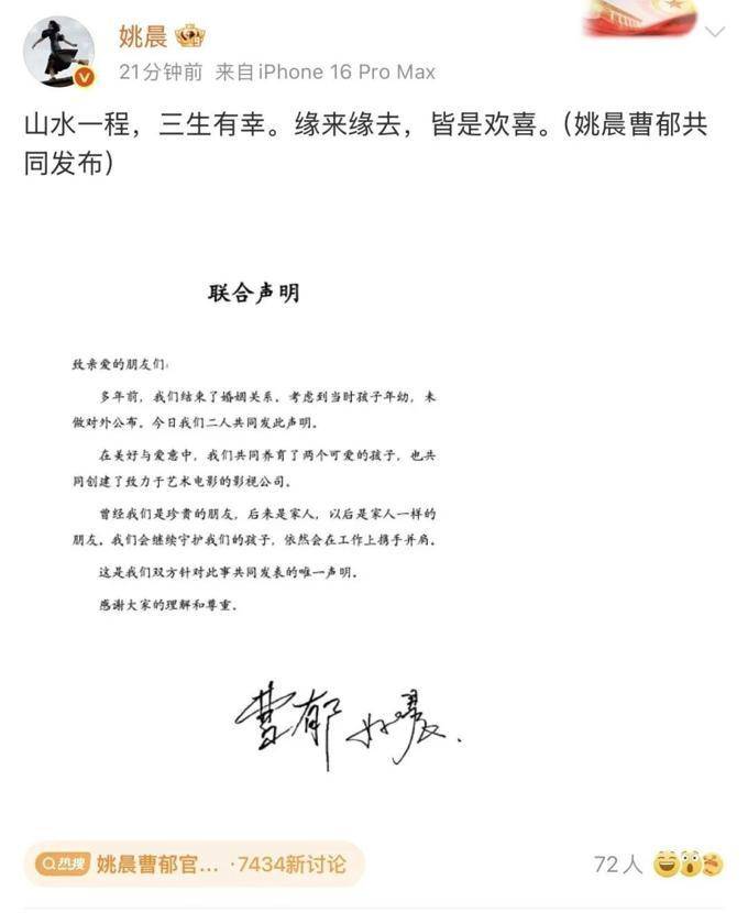 在2026年,姚晨和曹郁共同发布了一份官方声明,宣布离婚,内容为:“缘分的开始和结束,都充满了喜悦。”