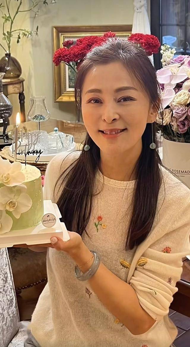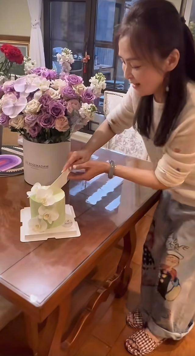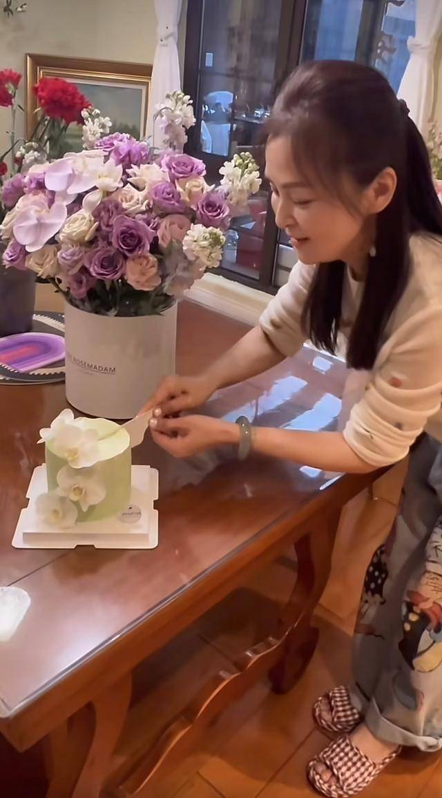 唱完生日歌,许完愿后,她切起了蛋糕,画面里出现的那盆花相当益彰。期间,她脸上一直挂满了笑容。