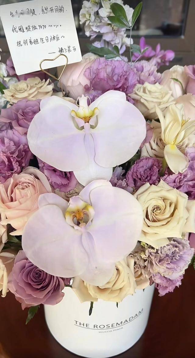在视频里,除了蛋糕,出现最多的就是鲜花,其中一盆鲜花上还有一张卡片,上面写着“与岁月同频,与花开同韵。优雅绽放岁岁有盼,祝何音姐生日快乐”。