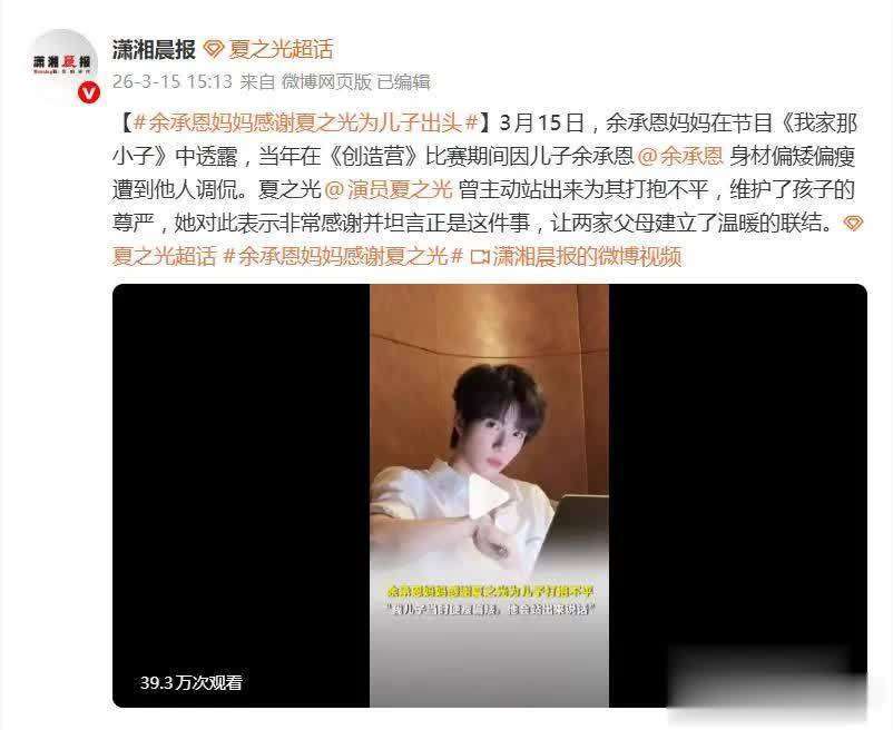 3月15日,有一段来自综艺《我家那小子2026》的回忆杀,温暖了许多人。余承恩的妈妈在节目中,公开向夏之光表示感谢,并透露自己曾为他投票,原因简单,却充满温情:七年前,在竞争激烈的《创造营2019》节目里,夏之光曾为身材偏矮、遭人调侃的余承恩挺身而出,仗义执言。