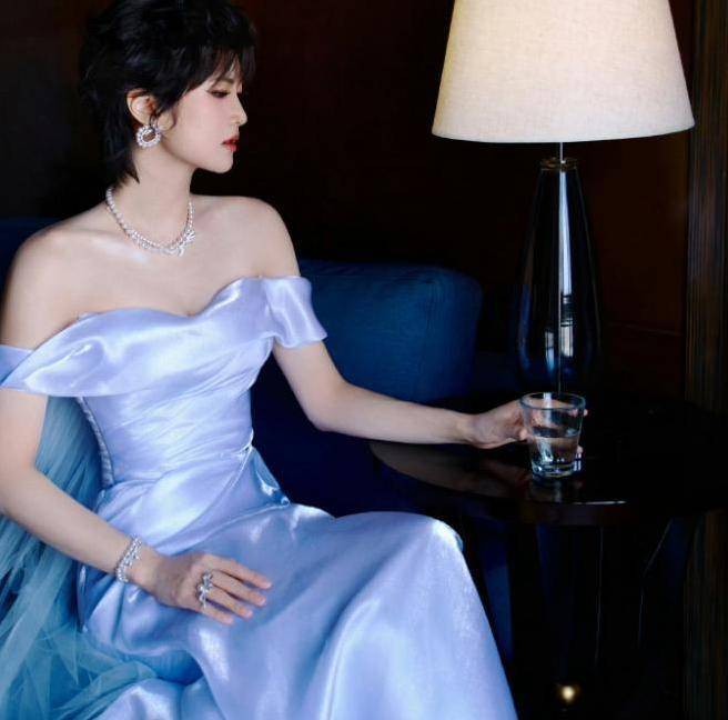 姚小姐所穿的这套礼服采用了一字肩的设计风格,展现出精美的肩颈线轮廓,简洁的短发与精致的马灯饰品相得益彰,既甜美又飘逸,