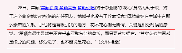 后来她就想明白很多,把一切归咎为缘分,就算男方花心,那也是缘分断了。(瞿颖被李亚鹏分手,也没有说过对方一句坏话)