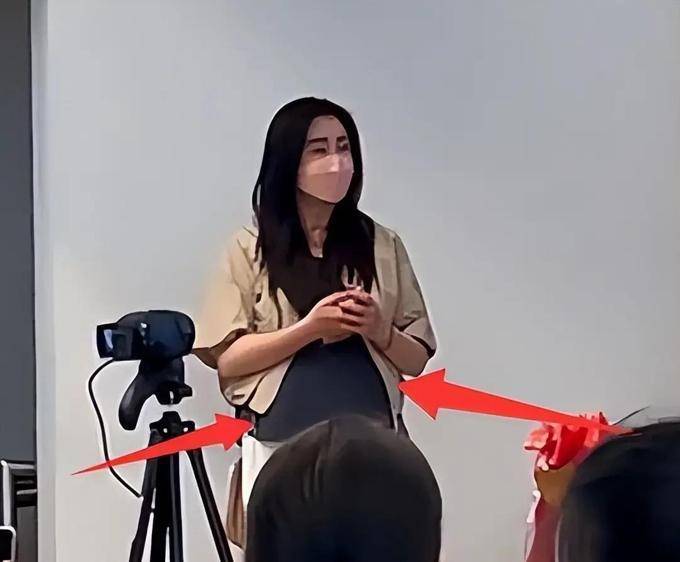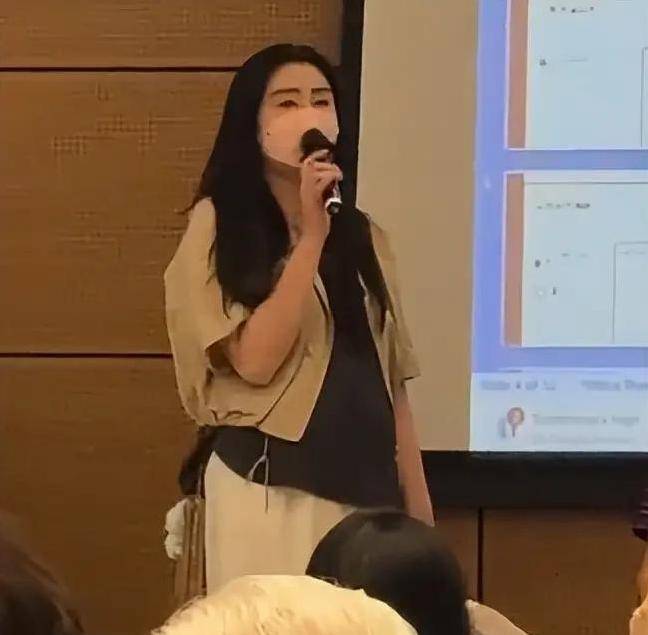 在做上台演讲时,摘掉口罩,脸看起来特别显眼,双下巴藏不住。腹内赘肉让宽松衣服已经支撑起弧度,如此身形与记忆中体态曼妙的聂小倩完全不同。
