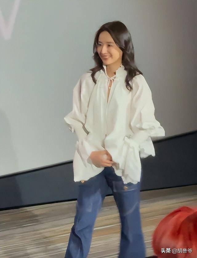 她当天穿了一件白色的泡泡袖衬衫,搭配深色的牛仔裤和黑色高跟鞋,一头微卷的长发随意披在肩上,往镜头前一站,那股韵味直接拉满。