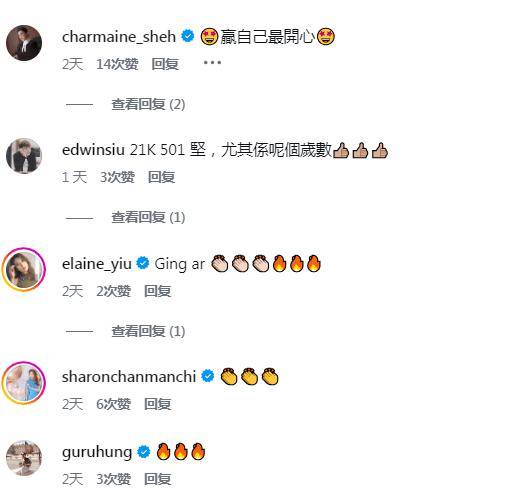 洪永城、姚子羚、陈敏之纷纷称赞,佘诗曼留言称:赢自己最开心!