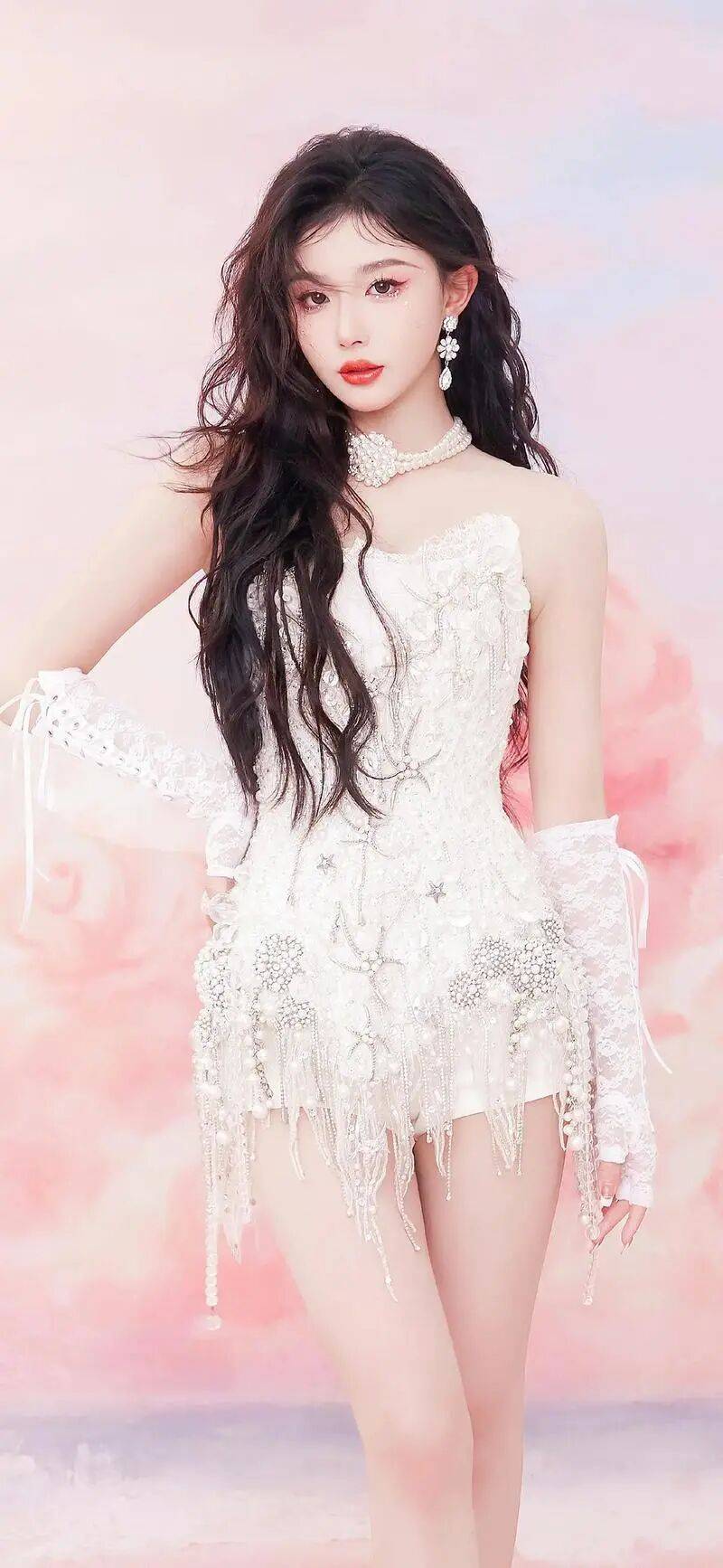 孔雪儿穿着白色抹胸短裙,她俏脸明艳,五官柔美,微微染红的长发飘逸,露出白皙的香肩修长的大美腿,绝对性感撩人!