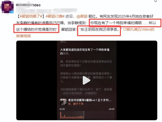 最近,瞿颖通过公开访谈间接承认自己是已婚状态,目前她与丈夫定居泰国清迈,组建了非传统的稳定家庭,引发热议!2025年4月,瞿颖在好友李静的播客节目《你,静不下来》中回应对方对其&l