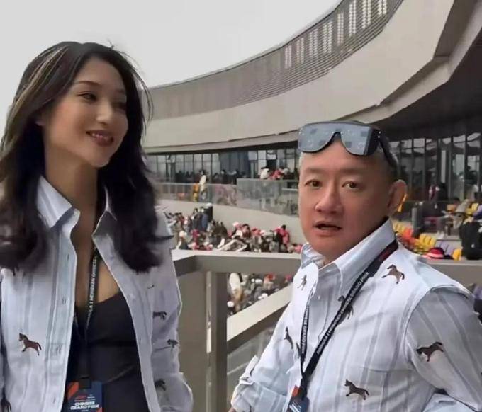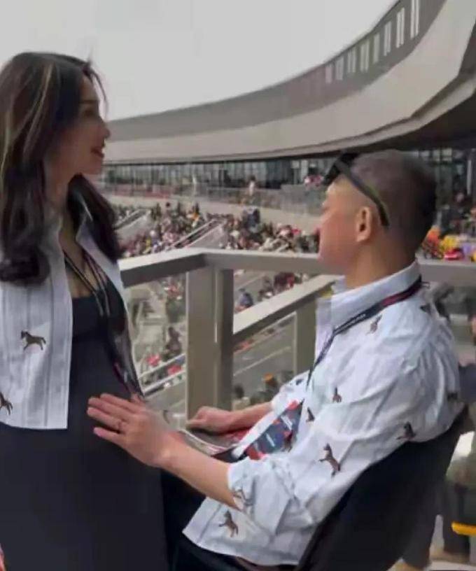 在3月25日的F1比赛中,崔璨被选为这对夫妇的展示场所。她目前正处于怀孕21周,身穿一条黑色的、带有装饰裙摆的长裙,脚上穿着精美的高跟鞋,手中还提着一个白色的毛绒绒的包包。