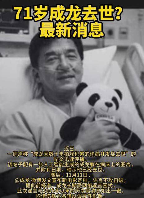 有人专门利用科技手段为成龙制作了一张躺在床上的照片,并将其改为黑白,然后附上一张图片,接着散播谣言称成龙已经去世,