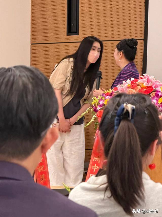 当天她穿着米白色中式立领上衣,长发挽在脑后,全程戴着浅蓝色口罩,低调得不想被人认出。