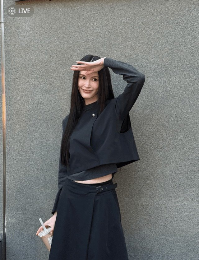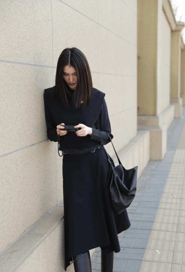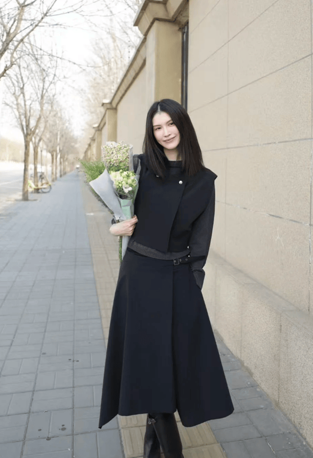照片中现身北京街头拍照的何穗,她以一身全黑造型亮相,展现出简约而高级的时尚感。何穗上身穿着一件设计独特的黑色短款上衣,拍照时的何穗抬起左手手掌遮在额前,仿佛在遮挡阳光,右手则自然下垂,手中拿着一杯饮料,整体姿态随性自然,充满生活气息。