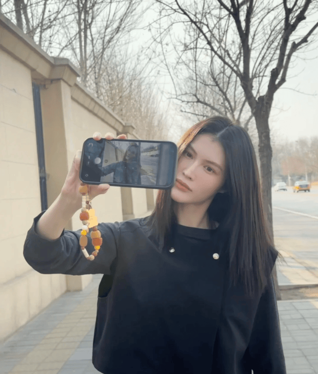 近距离捧着手机自拍的何穗,妆容自然清新,突出五官立体感,她的神情轻松愉悦,嘴角微微上扬,眼神明亮,流露出自信与从容。