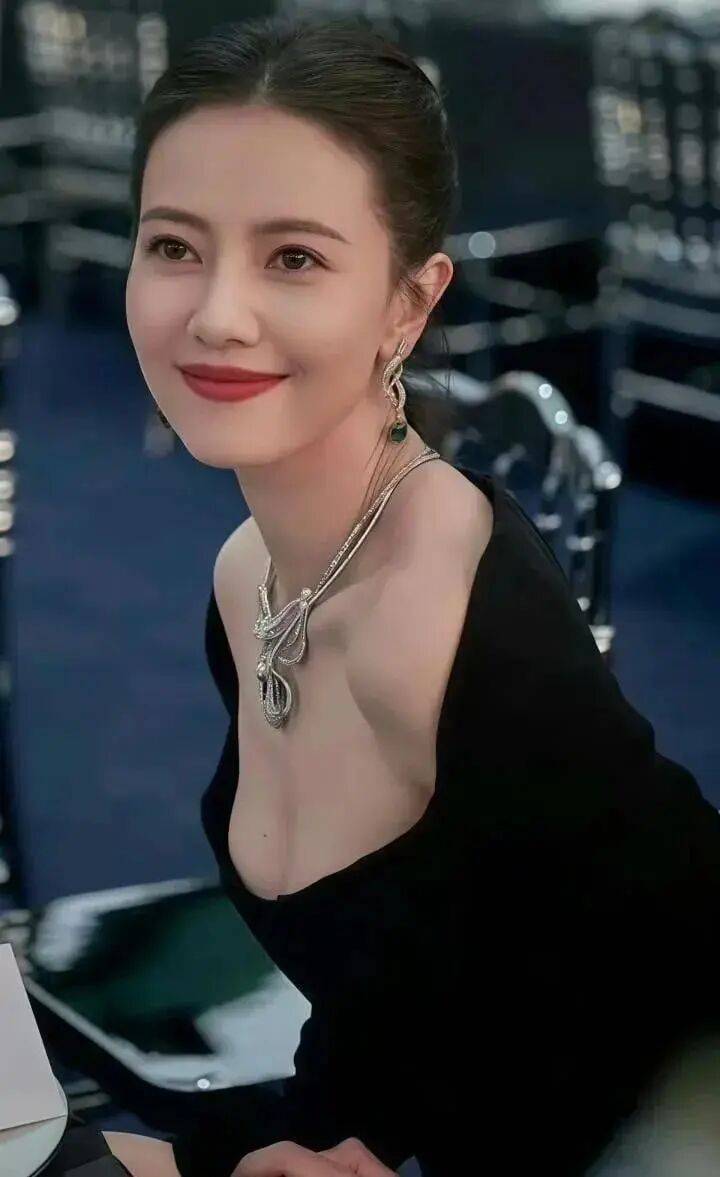 高圆圆穿着一袭黑色抹胸衣裙,脖子戴着金色绳索首饰,她俏脸喜笑颜开,侧身露出自己的事业线,绝对性感迷人!