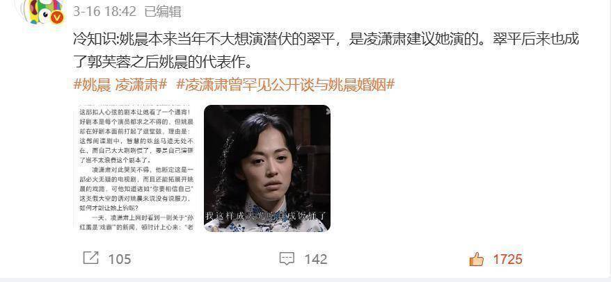 另外还听说当时姚晨还想带着凌潇肃一起进剧组,也就是让他出演《潜伏》中演情报贩子的谢若琳。只不过凌潇肃拒绝了,估计是看不上那点戏份,没想到的是后来演这个角色的曹炳辉却被这个角色给带火了。