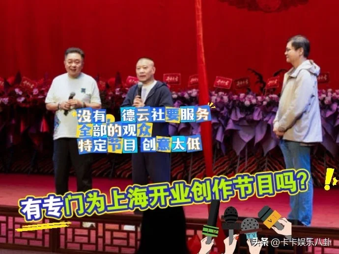 郭德纲表示,这个问题经常去各地甚至国外演出都会问到,明确回复“没有”,因为演出节目要适应不同场合、不同观众,如果专门打造一个,那当天演完,这个节目就“去世”了,那就没意义了。我们节目,不分地域、不分男女老幼观众,都能看、爱看,只要开心了,工作就完成了。