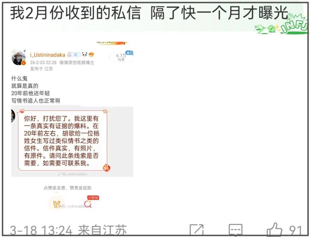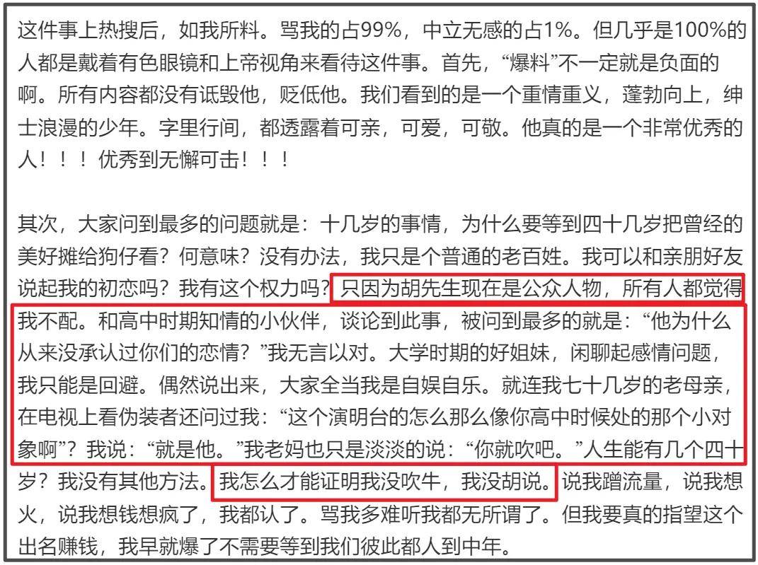 还说如果指着爆料出名赚钱,那她早就说了,不需要等到彼此都人到中年。最后还有点指责胡歌,怪他从没提起过这段感情,结尾还喊话妈妈,“这次你信了吧?我真没胡说八道。以后少看点《伪装者》”,对胡歌似乎有所不满。