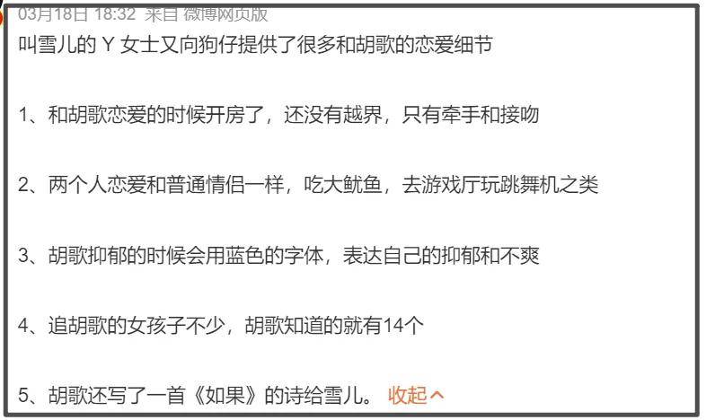 早期的胡歌在节目上确实自曝过恋情,当时的主持人问胡歌以前的女友最喜欢他唱哪首歌,胡歌说“那时候还没有唱歌”,后来又问为什么分手,胡歌爆料女方出国了,就分了。这两点和Y女士爆料的两人多以书信联系、出国后分手都对上了。