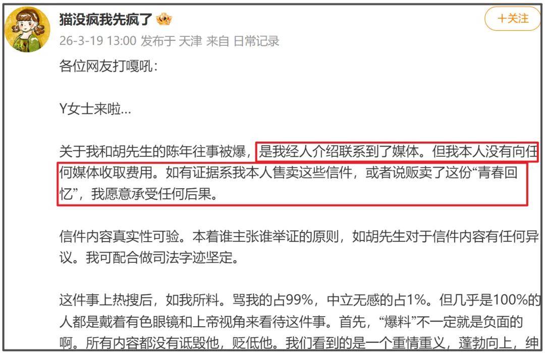 随后Y女士上线发长文做出回应,开头就承认自己经人介绍联系到媒体爆料,但否认收取费用,愿意承受任何后果。还强调信件内容真实性可验,如果胡歌有异议,女方可以配合做司法鉴定。