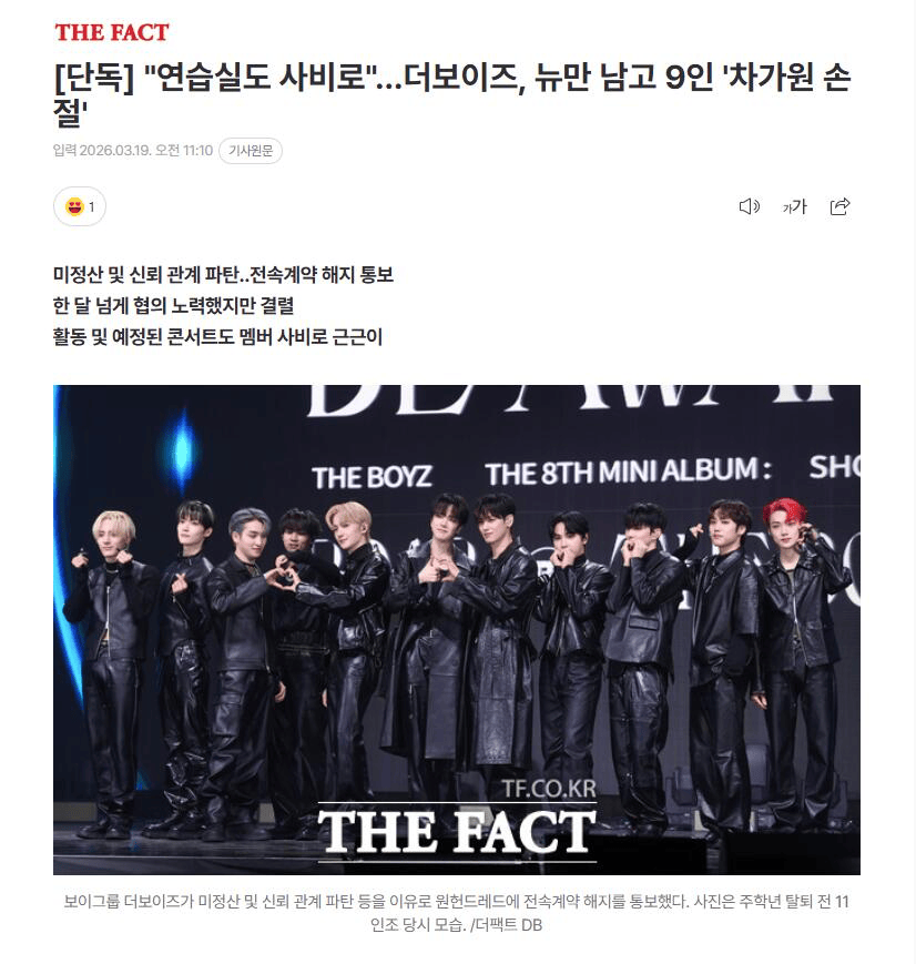 3月真是热闹不断,韩娱又空降一惊天大瓜——除一名成员外,男团THE BOYZ剩下九名成员宣布与经纪公司One Hundred解约!这听着嘛,好像也只是个娱乐圈常见到不能再常见的
