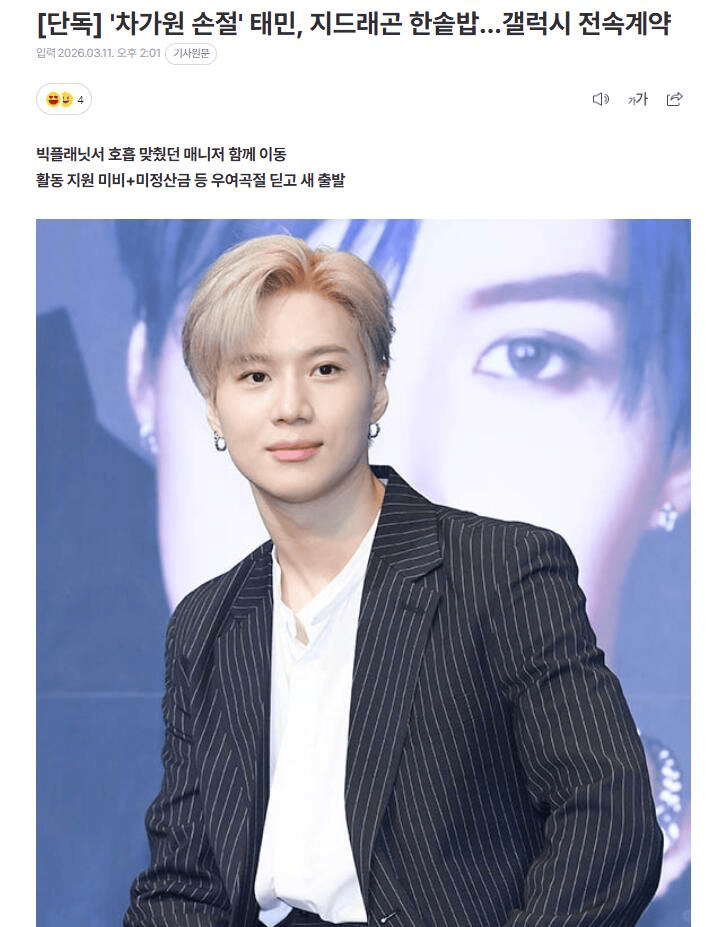 早在上个月底,国民度超高的SHINee李泰民宣布与车佳元公司提前解约——