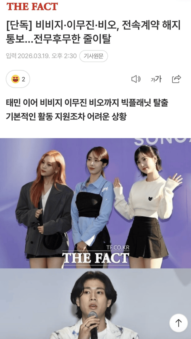 而就在THE BOYZ宣布解约的新闻引爆热搜后,旗下艺人VIVIZ、李茂珍、BE'O也纷纷通报与公司解除专属合约。