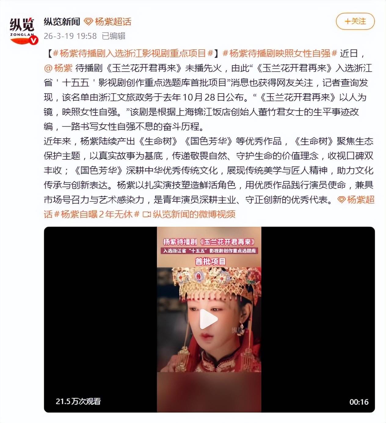 据3月19日报道,杨紫的待播剧《玉兰花开君再来》还没开播就先火了一把。原因无他,这部剧的名字赫然出现在了浙江省“十五五”影视剧创作重点选题库的首批项目名单里