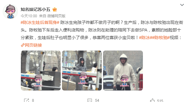 3月19日,娱记苏小五发布视频称陈冰"已生完孩子",画面显示陈冰素颜穿灰色长裙做SPA,腹部明显变小;陈牧驰则被拍到便利店购物后前往健身。