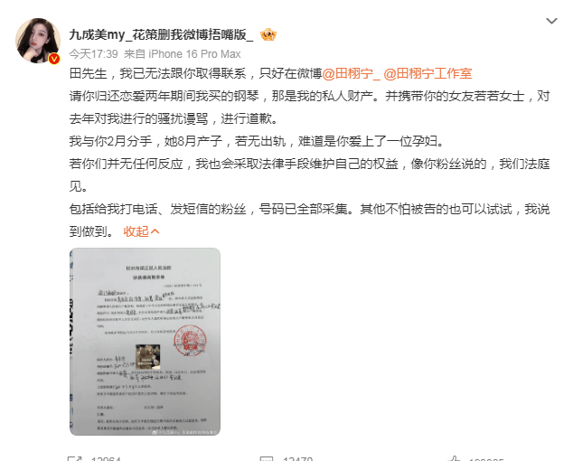 九成美自称田栩宁前女友,指控其在恋爱期间出轨致女性“若若”怀孕生子,要求田栩宁归还代为购买的钢琴。