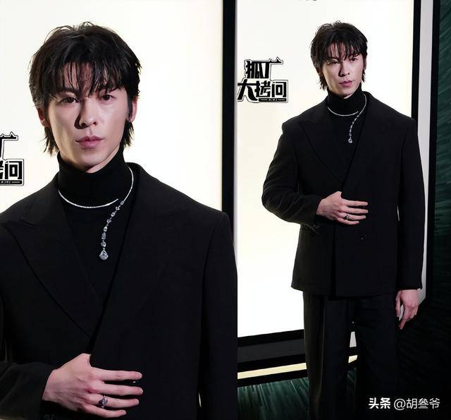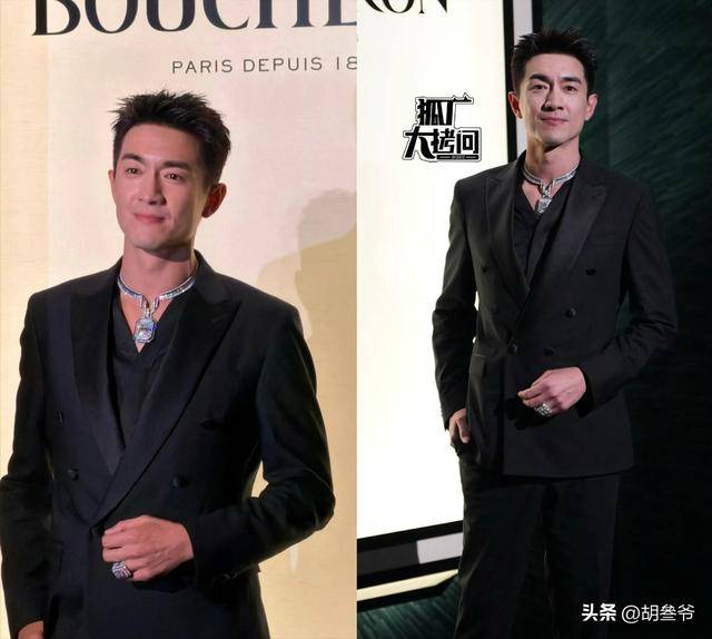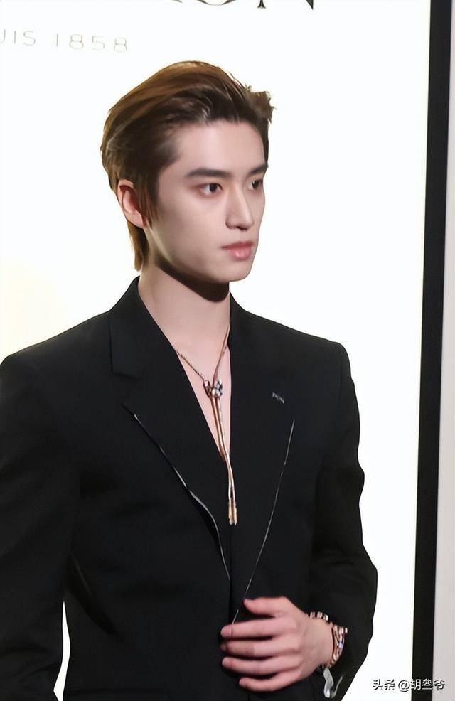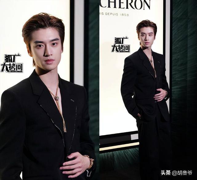 这次他穿了Givenchy的平驳领黑色套装,真空的设计露出精致的锁骨,额头露得干干净净,配上他俊朗的五官,贵公子的气质直接拉满。