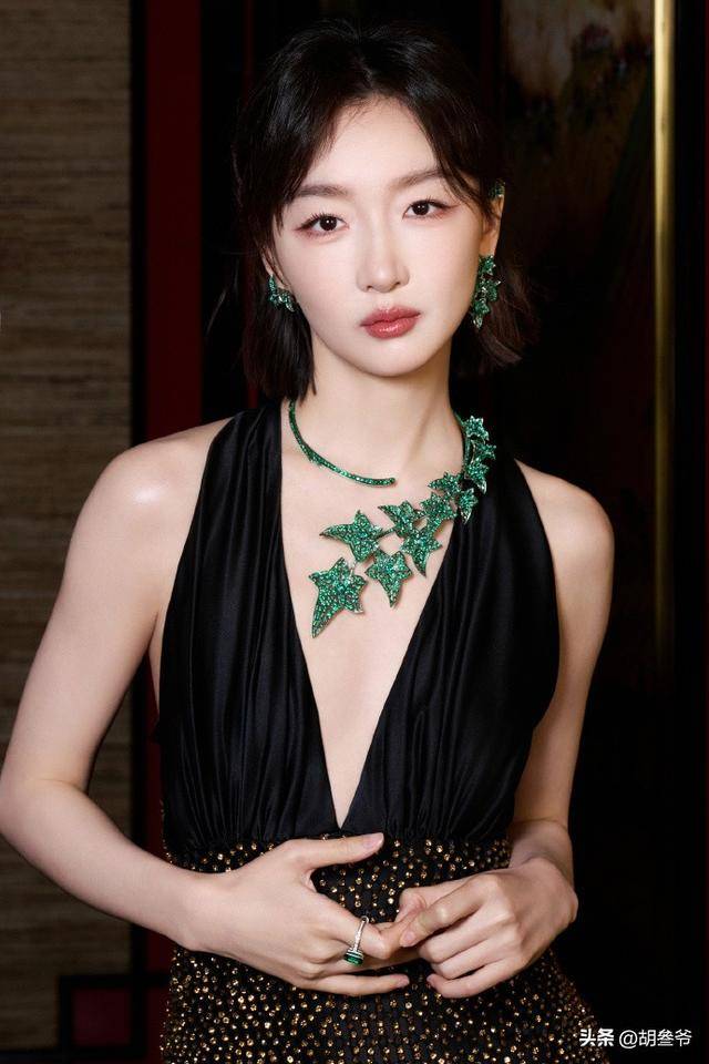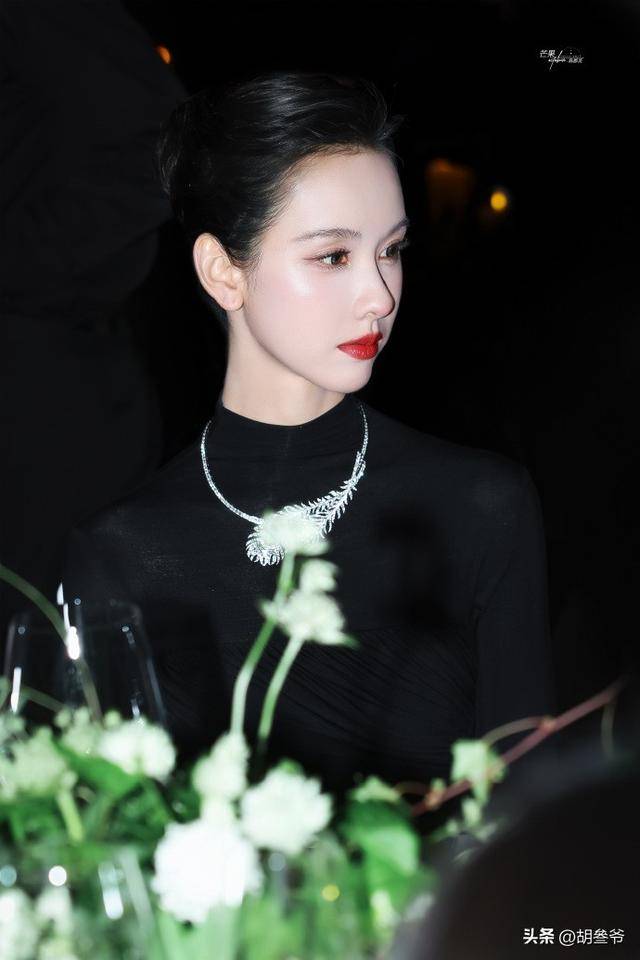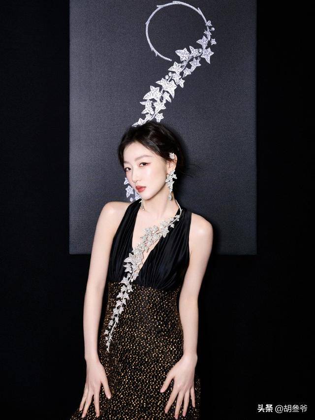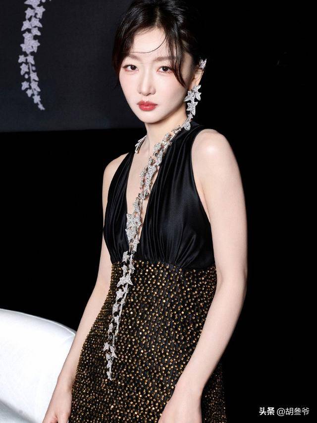 赫本式的简约优雅和东方女性的温婉柔和揉在一起,黑绸缎和贵气珠宝的质感碰撞,氛围感直接拉满,媒体都直接称她是“人形珠宝展示架”。