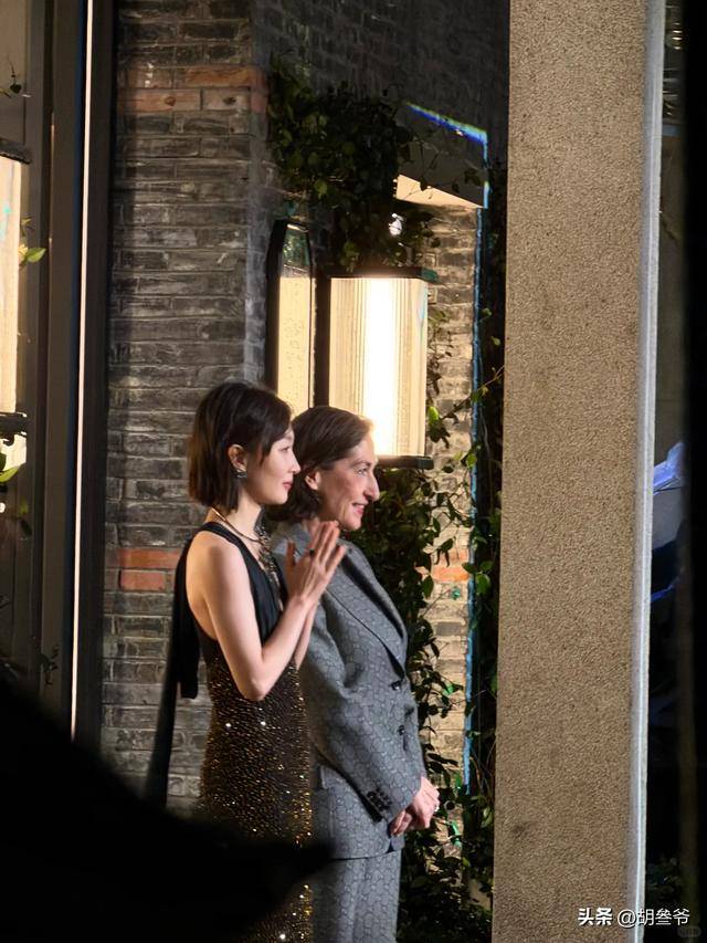 3月18日的开幕剪彩她就穿了深V鎏金亮片长裙亮相,当天上海还下着雨。
