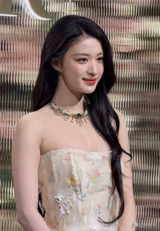 这次苏州晚宴,王楚然穿了一身浅杏色的抹胸花朵礼服裙,裙身上缀着立体的花卉,搭配温婉的盘发和精致的珠宝。