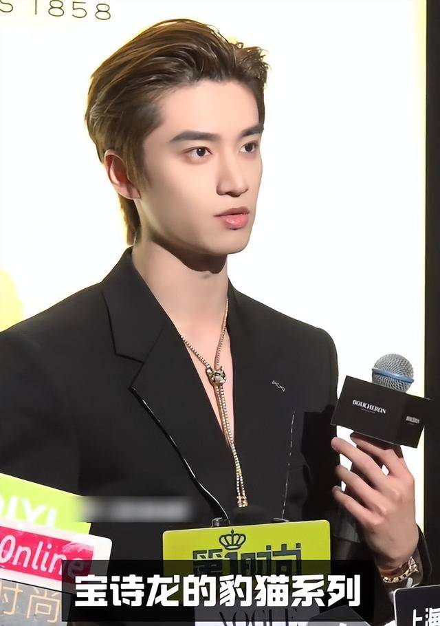 他身材偏瘦但不干瘪,肩线流畅,穿深V西装不显单薄,反而透着少年人的青涩张扬,面对镜头更是各种姿势手拿把掐哦,而且颜值能打,穿搭贴合活动高级调性,整体中规中矩。