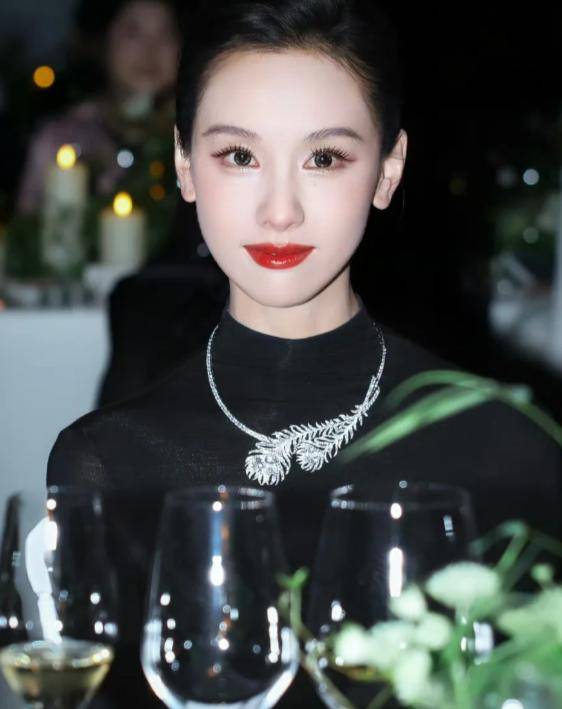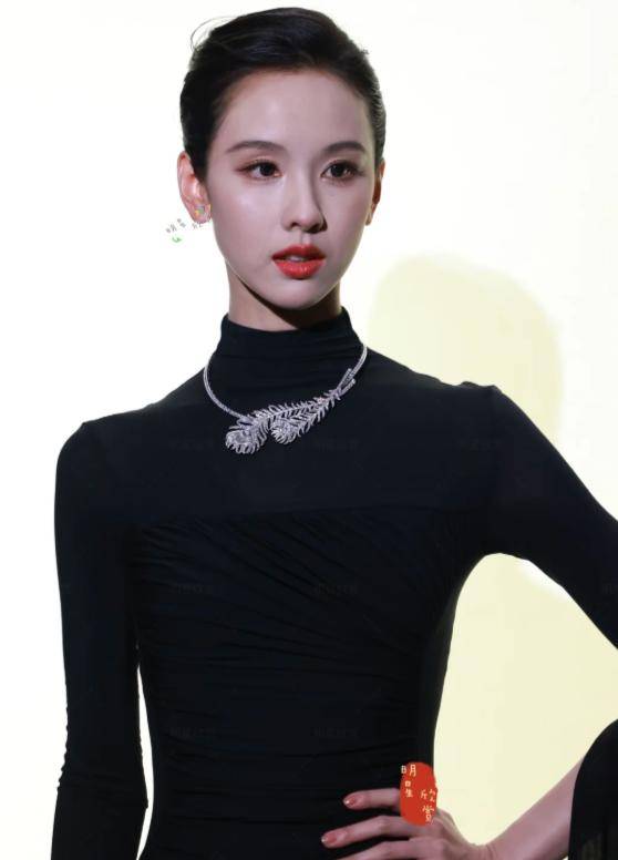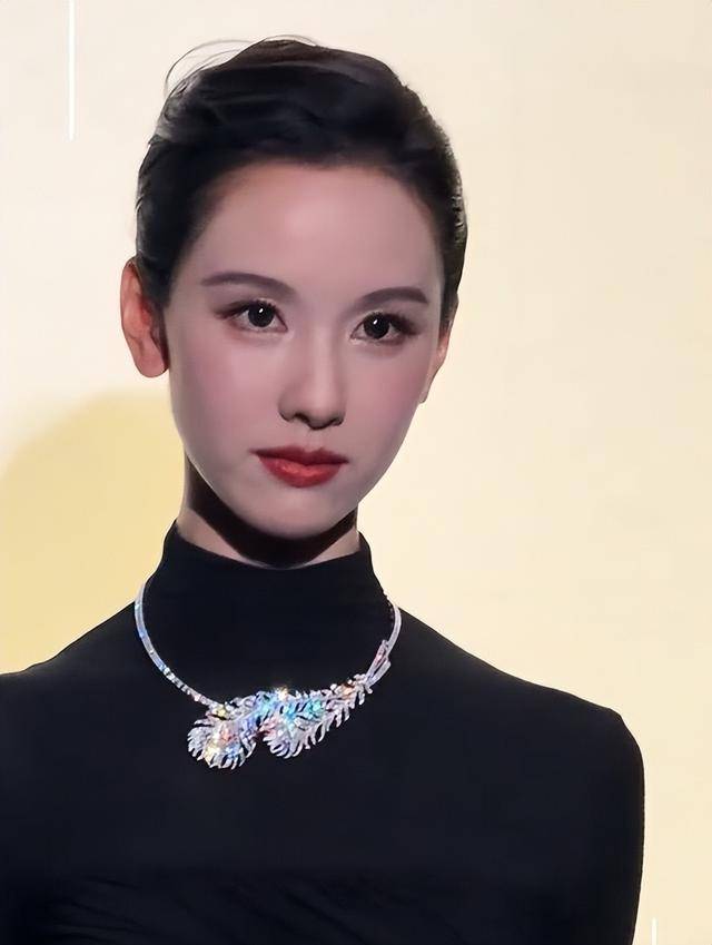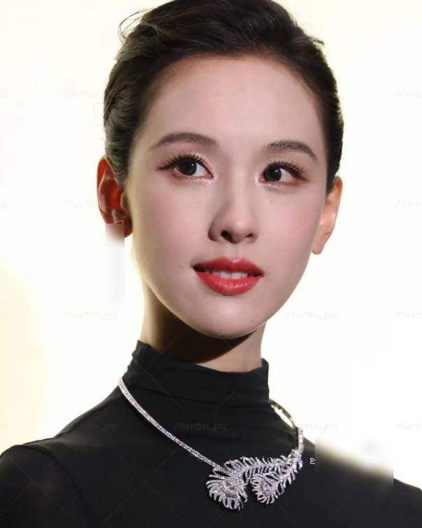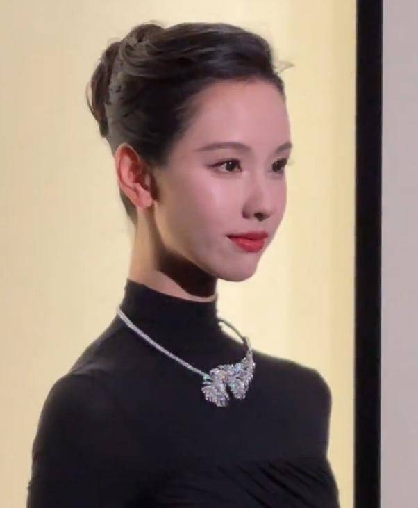 低盘发露出精致五官和纤细脖颈,简约宝诗龙项链与礼服相得益彰,生图中的她皮肤白到发光,五官精致如建模,眉眼清冷、从容不迫,#陈都灵黑天鹅既视感# 瞬间传开。