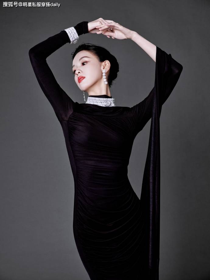 陈都灵清纯女神变身优雅女神!最近陈都灵出席某时尚品牌的高级珠宝展览,一袭黑色垂褶长裙搭配孔雀羽毛项链,高盘发造型展露优越头骨比例,被赞是顶级骨相!黑色高领修身裙,走路摇曳
