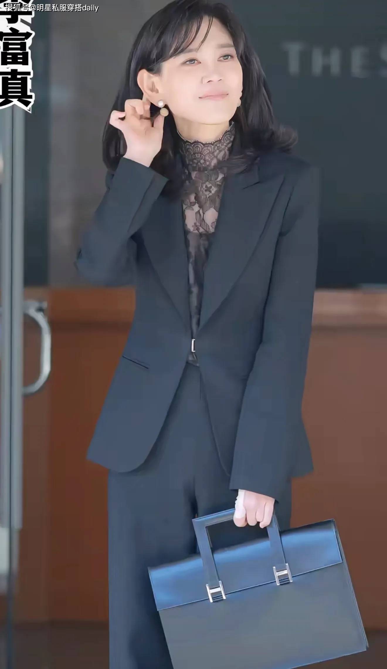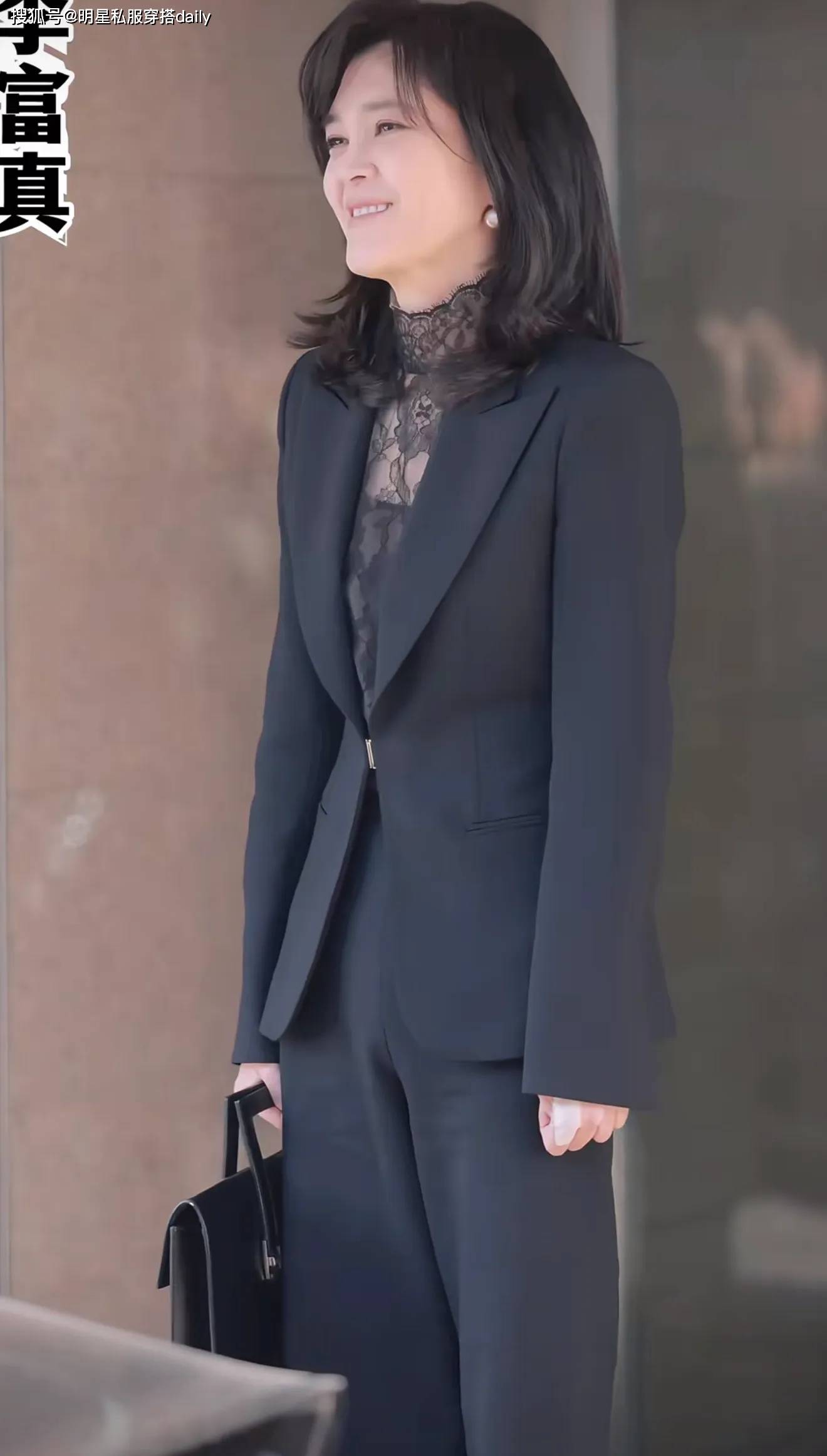 李富真一般会选择基础色,黑白灰是主色调,更多的是黑色系!穿对色彩是锦上添花的效果。但是对于大多数中年女性来讲,全黑不一定代表着单调,李富真巧妙的通过面料和设计感搭配出层次感。比如这次内搭黑色蕾丝打底衫,是显高级又不落俗套优雅搭配。