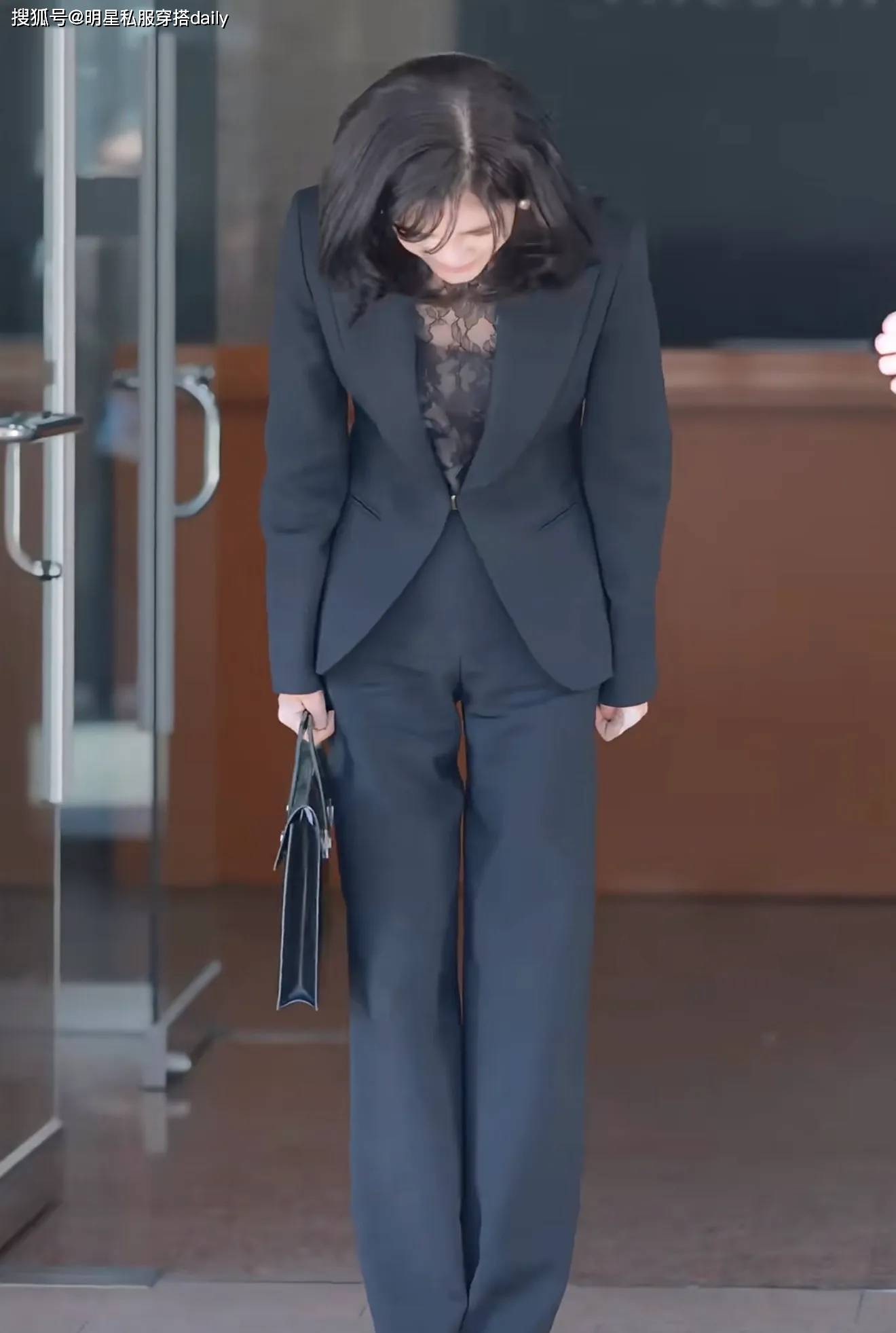 比如这次出现,她选择的黑色西装外套,就是直线型的西装设计,在腰部通过一粒扣设计向内收紧腰线,在腰上进行了视觉的分割。