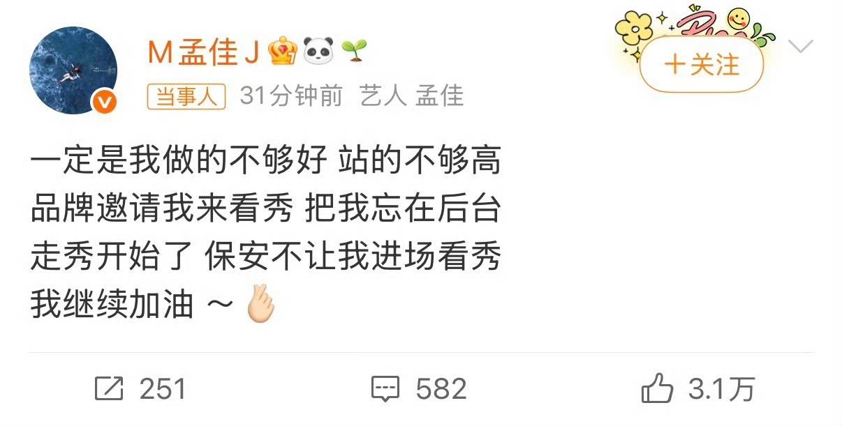 换做一般人,遇到这种糟心事,估计早就火冒三丈,在社交平台上把品牌方骂个狗血淋头了,但孟佳没有,她选择了一种特别高情商的方式回应。15:42,她在个人微博上发文:“一定是我做的不够好,站的不够高,品牌邀请我来看秀却把我忘在后台……保安不让我进场看秀。我继续加油~”