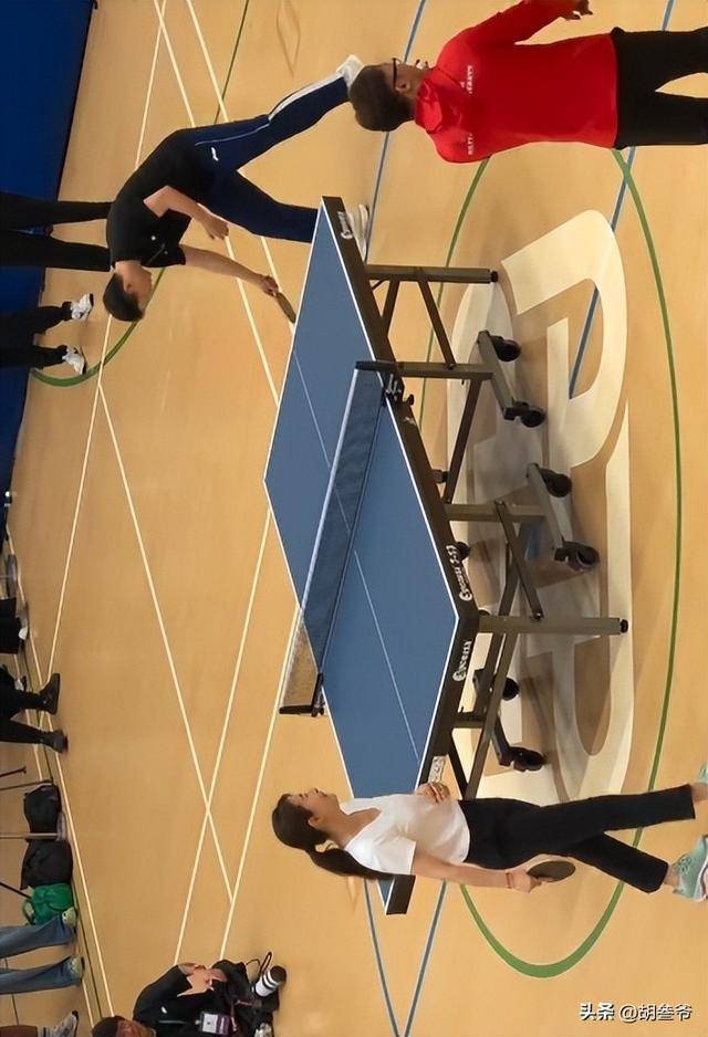 郭晶晶的球风可爱又认真,一改跳水赛场上的沉稳,偶尔接不到球时的小表情,让现场学生直呼可爱。