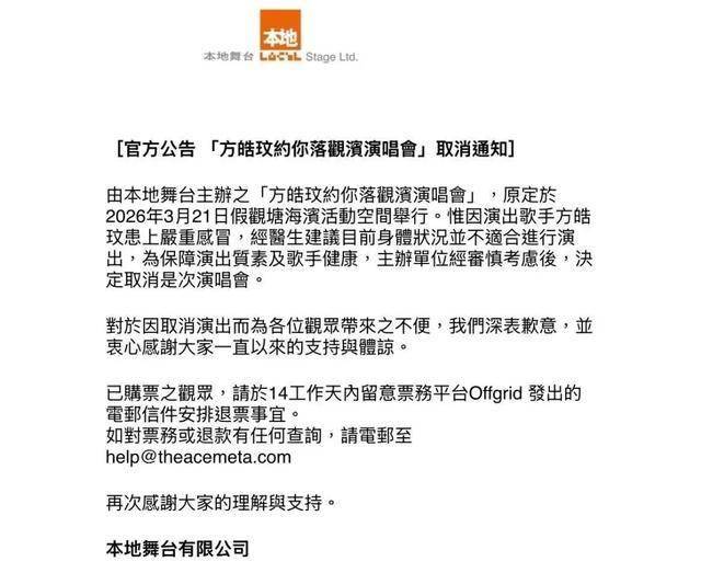 谢谢你们等我!请等主办方通知,交代详细的退票安排。"主办方也发出通告,说明演唱会取消,并表示已购票的观众,请于14个工作日内留意票务平台Offgrid发出的电邮信件,以安排退票事宜。