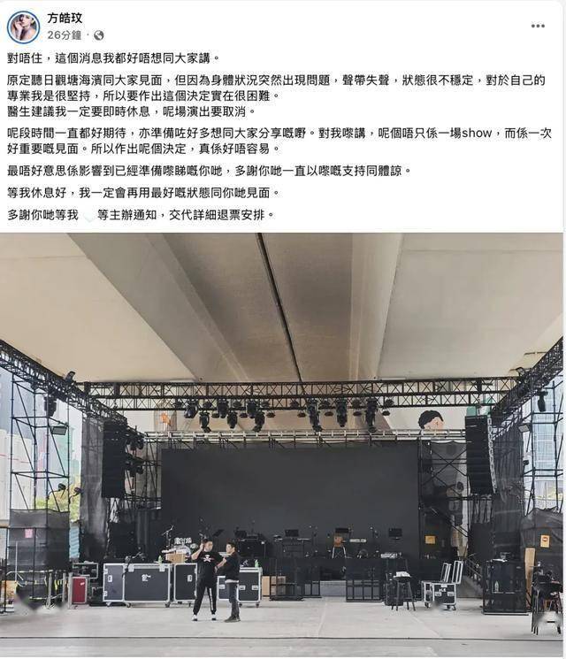 原定明天在观塘海滨与大家见面,但因为身体状况突然出现问题,声带失声,状态很不稳定,对于自己的专业我是很坚持的,所以要作出这个决定实在很困难。医生建议我必须马上休息,这场演出要取消。