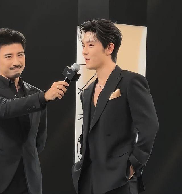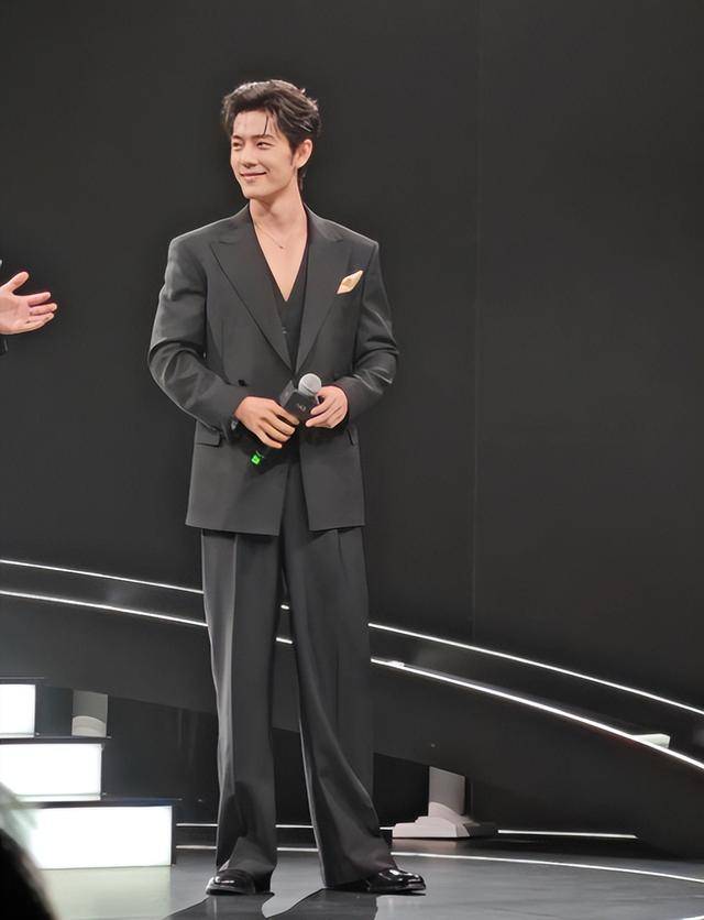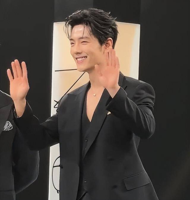 他当天穿了一身黑色深V西装,版型利落又贴合身形,领口恰到好处地露出清晰的胸线,不刻意张扬,却自带高级感,没有多余的装饰,只靠简约的剪裁,就把绅士风度和男性魅力展现得淋漓尽致。