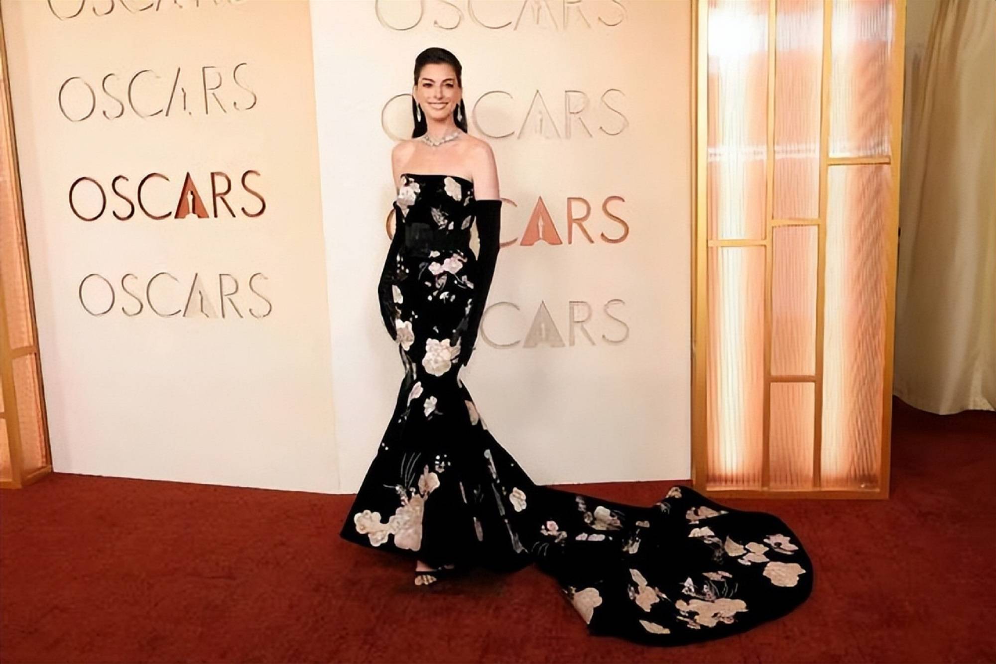 她身着一袭黑色丝绒高定鱼尾裙,贴身剪裁完美勾勒身形曲线,裙身绣满了大朵盛开的粉色花朵,在灯光下泛着低调奢华的光泽,搭配复古盘发与重量级钻石珠宝,端庄又大气,让人想起了她的成名作《公主日记》,只不过如今已从少女公主的青涩变成了长公主的高贵。