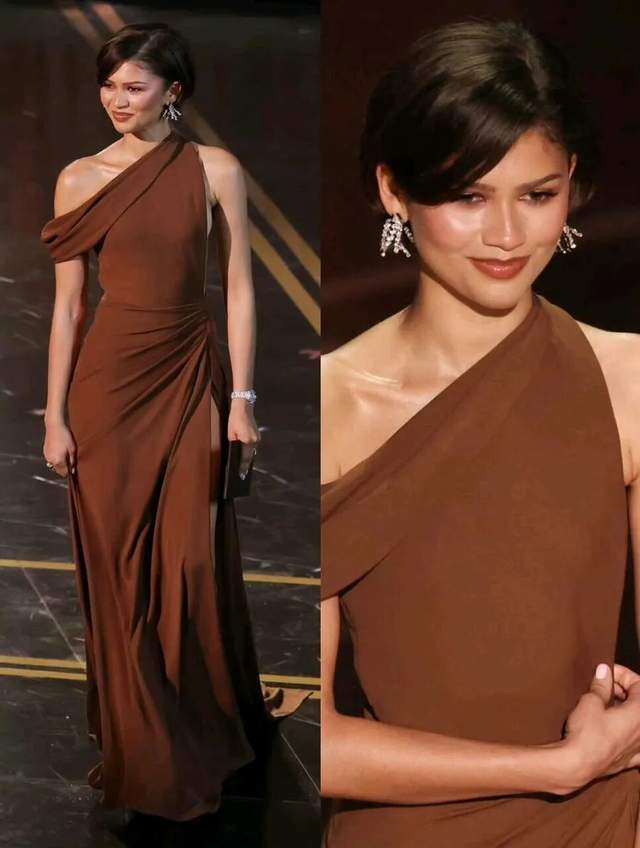 因为不走红毯,所以她摒弃华丽堆砌,选择一袭极简的褐色斜披肩长裙,哑光质感内敛又高级,干净利落的线条完美衬出修长身形。