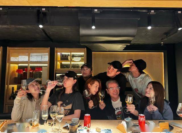 在第二张大合照里,他们都放下了酒杯,做着不同的搞怪表情,画面看起来很是搞笑。在第一排,最搞笑的就是蔡少芬,真是一点没有偶像包袱,看那嘴,那脸型,真是笑死人不偿命。78岁的姜大卫也跟他们玩起来,那表情很自然。