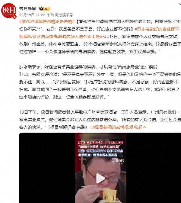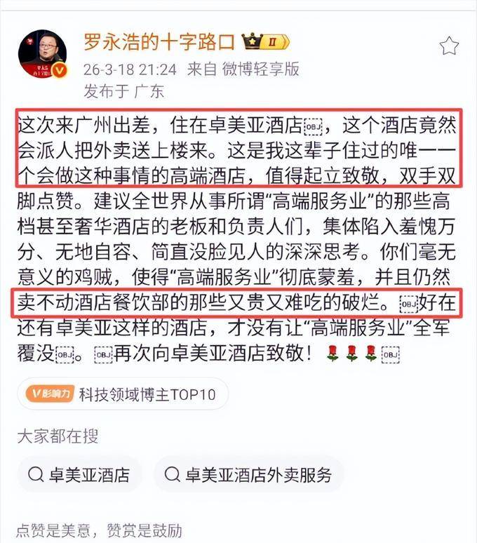 一开始看到罗永浩在住酒店的时候,称赞酒店把外卖送上楼的服务后,很多网友都觉得没有什么大不了的,